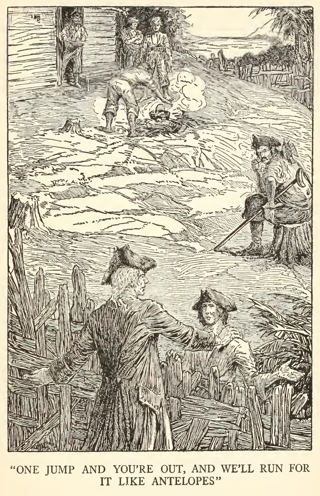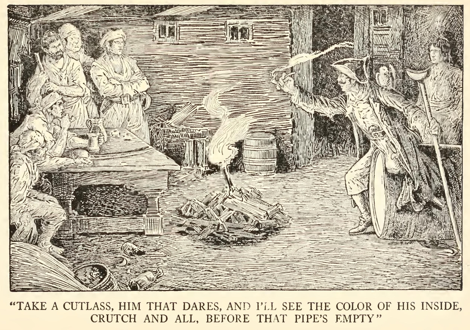 Well, there we stood, two on one side, five on the other, the pit between us, and nobody screwed up high enough to offer the first blow. Silver never moved; he watched them, very upright on his crutch, and looked as cool as ever I saw him. He was brave, and no mistake.