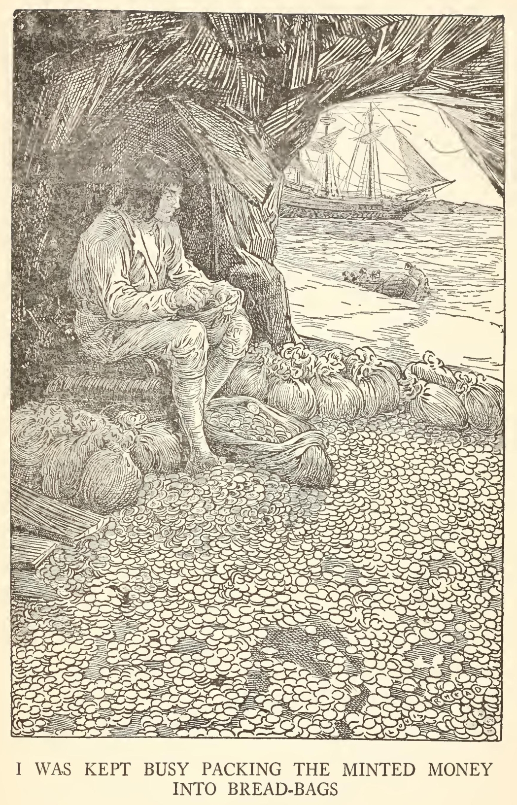 It was a strange collection, like Billy Bones’s hoard for the diversity of coinage, but so much larger and so much more varied that I think I never had more pleasure than in sorting them. English, French, Spanish, Portuguese, Georges, and Louises, doubloons and double guineas and moidores and sequins, the pictures of all the kings of Europe for the last hundred years, strange Oriental pieces stamped with what looked like wisps of string or bits of spider’s web, round pieces and square pieces, and pieces bored through the middle, as if to wear them round your neck—nearly every variety of money in the world must, I think, have found a place in that collection; and for number, I am sure they were like autumn leaves, so that my back ached with stooping and my fingers with sorting them out.