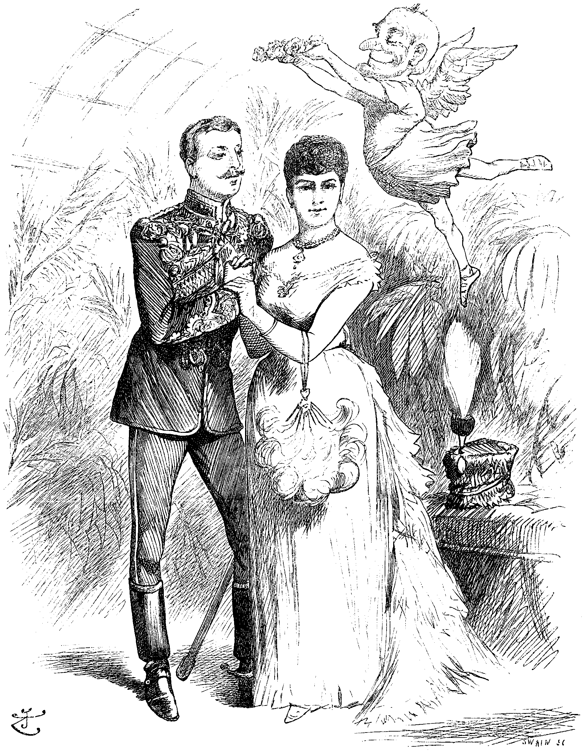 The Baron's Assistants say that of the Christmas works published by Messrs. HUTCHINSON & CO. they can and do recommend The Children of Wilton Chase by L.J. MEAD, to which they accord their mead of praise, which likewise they bestow on FLORENCE MARRYAT's The Little Marine and the Japanese Lily, a book of adventures in the land of the Rising Sun, which will delight many rising sons for whom chiefly was this book intended. There are always "more ways than one," and so Where Two Ways Meet there is like to be a puzzle, solved in this instance by the authoress, SARAH DOUDNEY. Put down the books! Come to the festive board! Down—(the right way of course) with the mince-pie and plum-pudding! Strange is it that the source of so much enjoyment, the very types of Christmas good cheer, should themselves be so "down in the mouth" as invariably are Mathew Mince-pie and Peter Plum-pudding at this festive season. And they being gone and cleared off, enter a gentleman bearing the unusual and remarkable name of SMITH—familiarly welcomed as "TOM" of that ilk—and then pop go the crackers! "But we must keep the secret," whisper the Baron's Assistants, and they strongly advise everyone not to peep into this boîte à surprise until Christmas Day itself. So, for SPARAGNAPANE's "charming confections, which," as the Baron's young lady clerks, BLYTHE and GAY, observe, "are in the very highest style of 'High Art'; and the same Mr. SPARE-NA-PAIN's Darkest Evening, and How to Get Out of It, will be tidings of comfort and joy to many a holiday-making household."