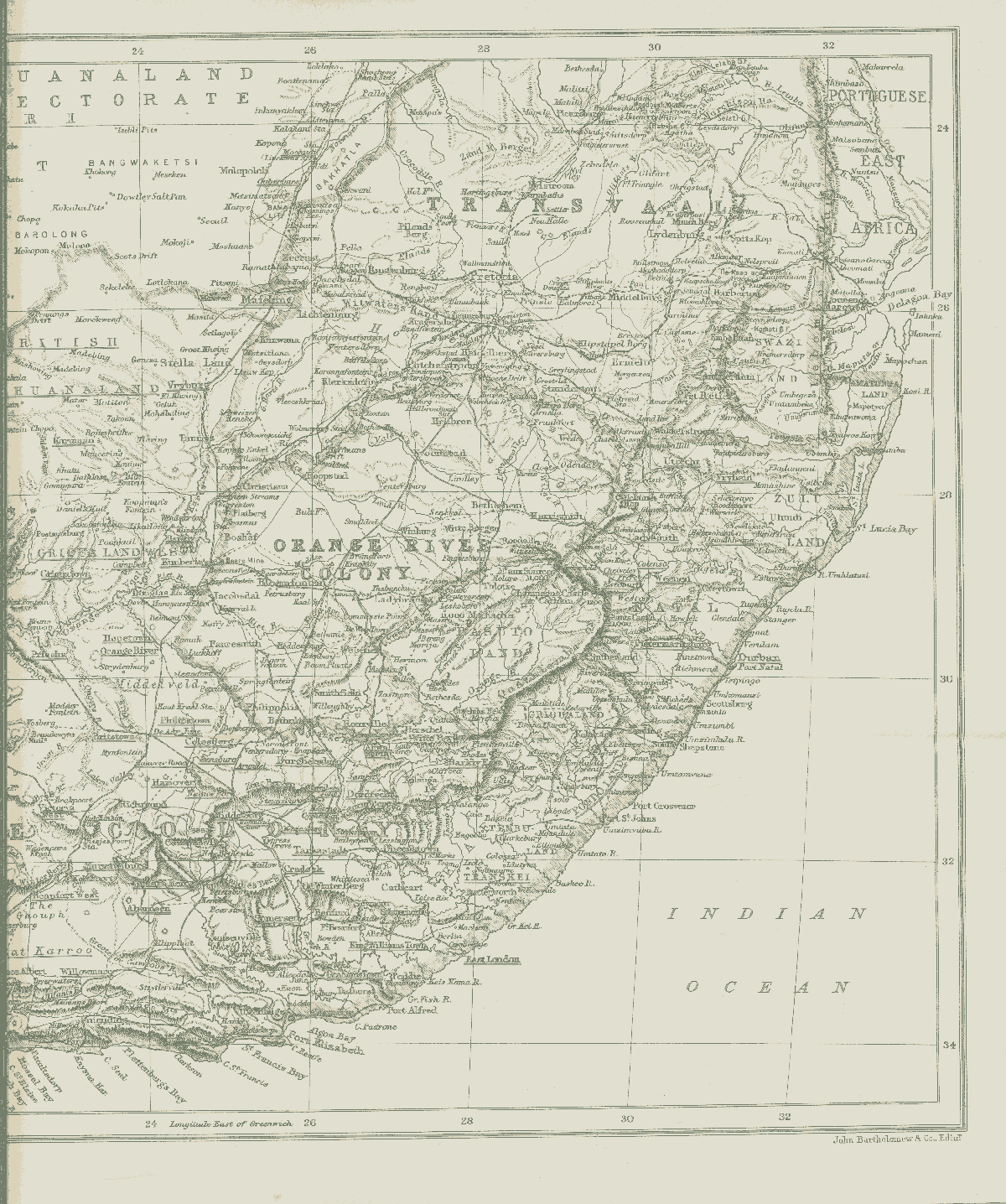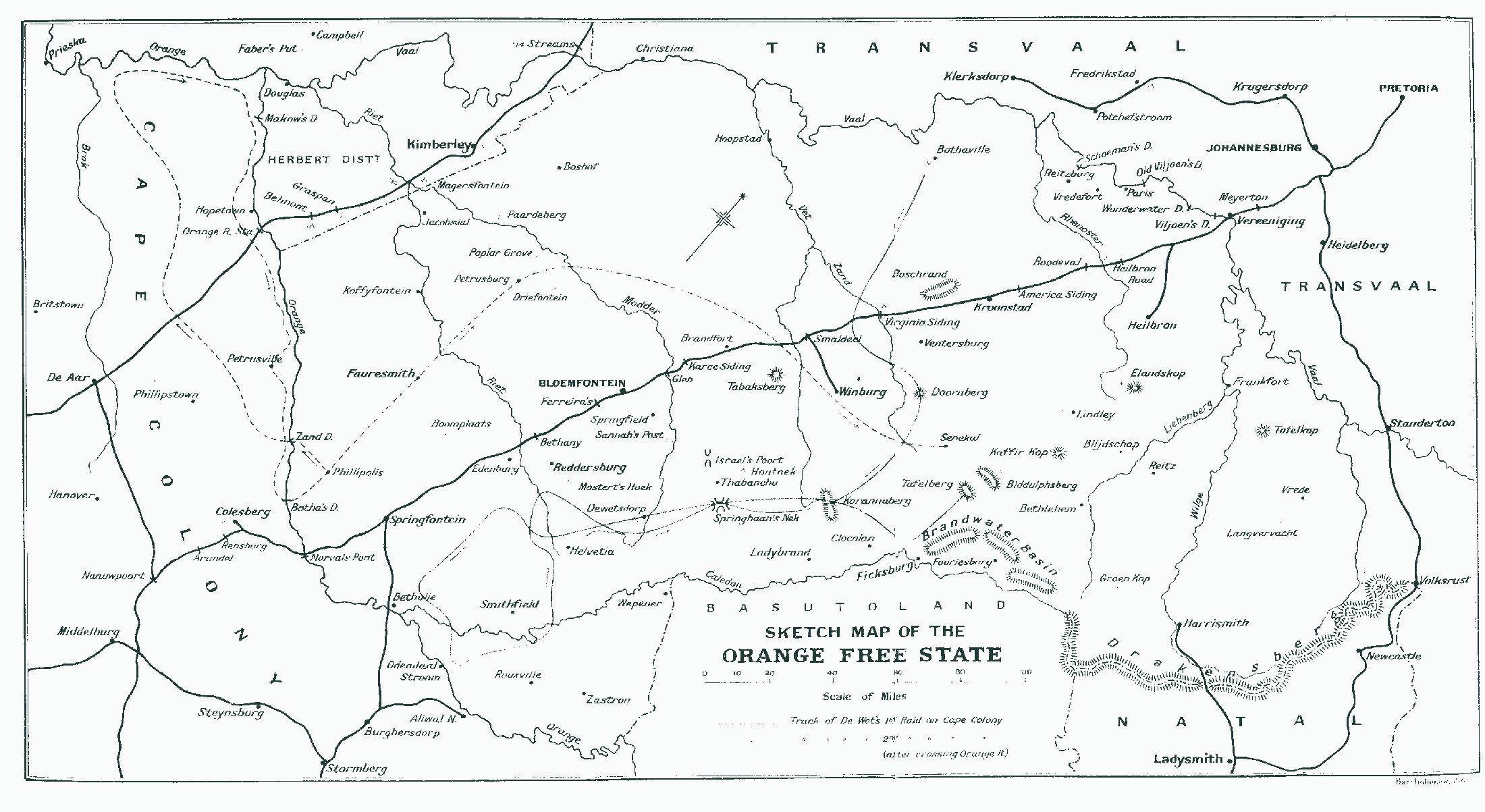 "An Army of 100,000 men is the utmost that Great Britain will be able to place in the field in South Africa, for the Indian and Colonial drafts must be provided for, and the Militia and other Auxiliary Forces, which are not of much account, are tethered to the country; but it will be sufficient for the purpose. Although the military system of Great Britain is hopelessly behind the times, she has always done wonders with her boomerangs, bows and arrows, and flint instruments. That Army will be fairly well furnished with modern weapons and equipment, and the excellent personality of the soldier will compensate to a great extent for incapacity in the Staff and superior officers. With this Army she will have to meet a brave but undisciplined opponent whose numbers cannot be estimated. Even if the Free Staters are included it is improbable {7} that more than 100,000 men can be put into the field. These have had no military training, their leaders will be unprofessional officers who will be unable to make good use of the munitions of War which the two Republics have been strangely allowed to import through British ports and to accumulate in large quantities. If the burghers of the Orange Free State throw in their lot with the Transvaalers, which is improbable as they have no quarrel with Great Britain, the numbers opposed to her will certainly be augmented, but the task before her will be greatly simplified. Instead of having to send one portion of her Army by way of Natal to effect a junction in the Transvaal, with the other portion working northwards through Kimberley and Mafeking, a campaign which would involve two long and vulnerable lines of communication, she will be able to strike at once through the heart of the Free State and will advance without much difficulty to Johannesburg and Pretoria. The hardest part of her task will be the passage of the Vaal, where a great battle will be fought, and the capture of Pretoria, which is reported to be well fortified. With Bloemfontein, Johannesburg, Pretoria and the railways in the possession of Great Britain, the opposition will collapse in a very few weeks, for no nation has ever been able to carry on a struggle when its chief towns and means of communication are in the enemy's possession."
