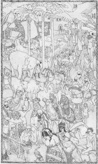 Eines Tags, als er in der Stadt spazieren ging, hörte Alaeddin mit lauter Stimme einen Befehl des Sultans ausrufen, daß jedermann seinen Laden und seine Haustüre schließen und sich ins Innere seiner Wohnung zurückziehen solle, bis die Prinzessin Bedrulbudur, das heißt »Mond der Monde«, die Tochter des Sultans, die baden wollte, vorübergegangen und wieder zurückgekehrt sein würde.