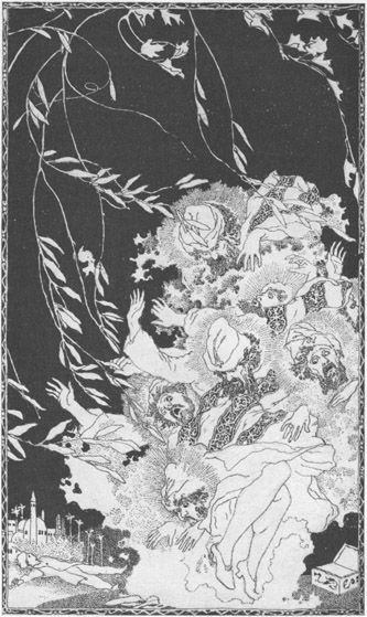 Alaeddins Mutter war nicht imstande zu antworten. Ihr Auge vermochte die abscheuliche und schreckliche Gestalt des Geistes nicht zu ertragen, und sie war gleich bei seinen ersten Worten vor Angst in Ohnmacht gefallen.