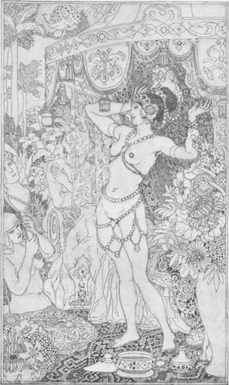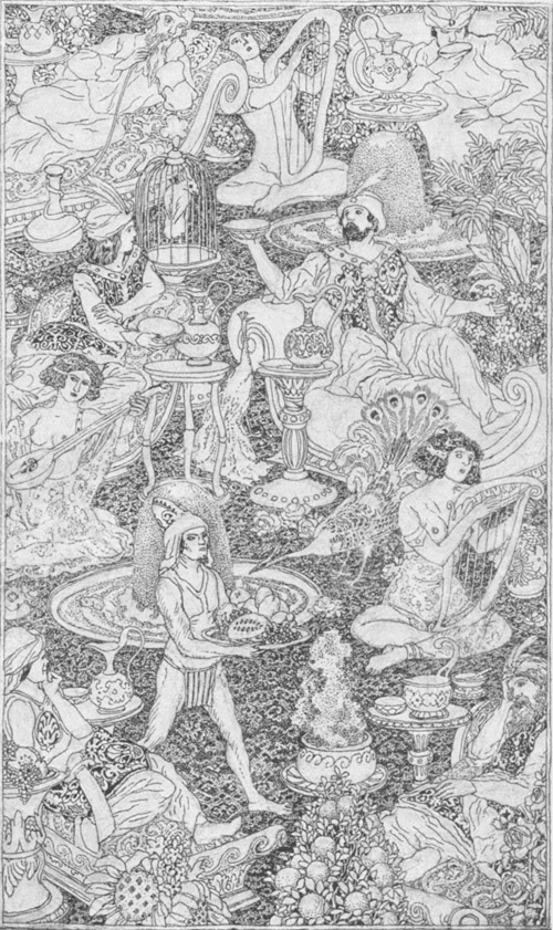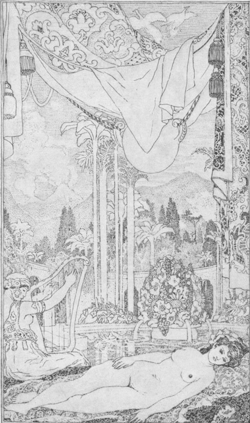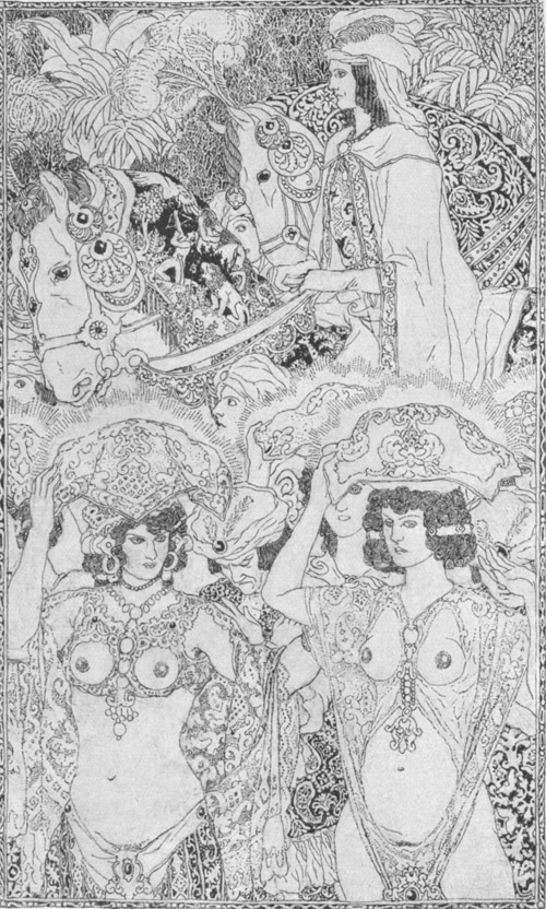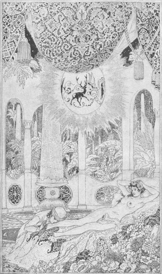 Dieser öffentliche Aufruf erweckte in Alaeddin den Wunsch, die Prinzessin entschleiert zu sehen. Er mußte sich zu diesem Behuf in das Haus eines Bekannten begeben und dort hinter ein Gitterfenster stellen; allein dies war ihm nicht genug, da die Prinzessin, dem Brauche gemäß, auf ihrem Weg ins Bad einen Schleier vor ihrem Gesichte haben mußte. Um seine Neugierde zu befriedigen, ersann er endlich ein Mittel, das ihm glückte. Er stellte sich nämlich hinter die Türe des Bades, das so eingerichtet war, daß er sie unfehlbar sehen mußte.