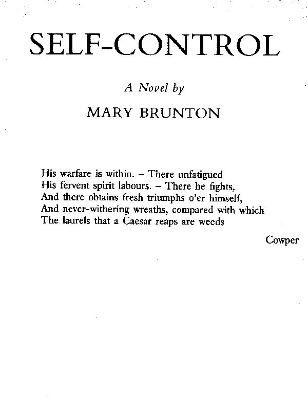 The Project Gutenberg EBook of Self-control, by Mary Brunton This eBook is for the use of anyone anywhere at no cost and with almost no restrictions whatsoever. You may copy it, give it away or re-use it under the terms of the Project Gutenberg License included with this eBook or online at www.gutenberg.org Title: Self-control Author: Mary Brunton Release Date: October 27, 2012 [EBook #41196] Language: English Character set encoding: ISO-8859-1 *** START OF THIS PROJECT GUTENBERG EBOOK SELF-CONTROL *** Produced by Delphine Lettau, fh and the Online Distributed Proofreading Team at http://www.pgdp.net