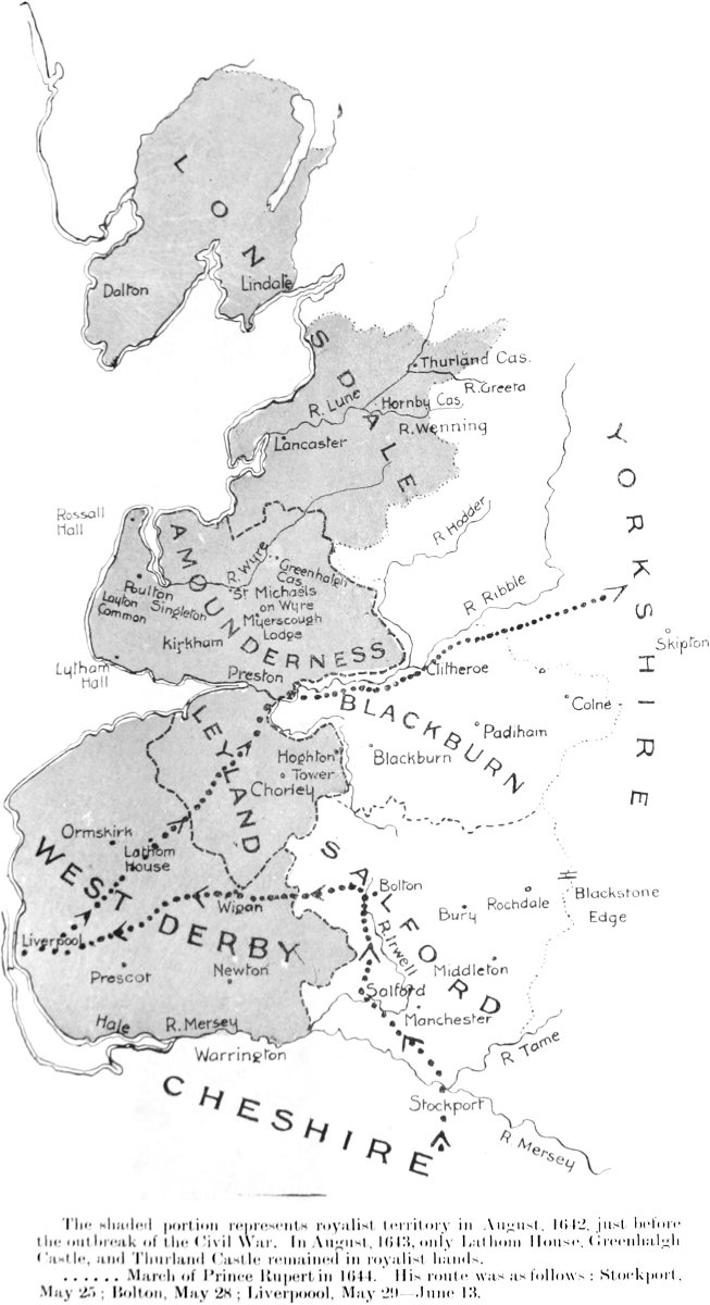 These geographical conditions had two great effects on the war in Lancashire. In the first place they enabled the issue to be decided within the county without help or hindrance from outside. There was of course some connection with Yorkshire and Cheshire, but mostly in the later years of the war; at first the war was fought[Pg 3] out by local troops within the county itself. This is no drawback to the study of our subject, for the Civil War was very largely a local war and can best be studied locally. It was not, like the Wars of the Roses, a dynastic struggle, in which the nation generally had no direct interest; but its causes, political, religious and social, went down to the primary divisions of opinion among Englishmen which have existed ever since, and to some extent do so to-day. The course of the Civil War in Lancashire shows the working out on a smaller stage of the main principles of the period. The religious question was of course very prominent. The local royalists were either in sympathy with the King's ecclesiastical policy, or they were Roman Catholics. Lancashire had been conservative in religion, and there was a very large Roman Catholic population; particularly the west coast and the Fylde adhered, as to some extent they still do, to the ancient faith. And though at first Catholics were not openly included in the royalist armies, and indeed Lord Strange's first warrants definitely excluded them,[1] the exclusion was only temporary. A petition of the Lancashire recusants to the King to bear arms 'for their own defence' was granted, and paved the way for their admission to the royalist ranks. Some of the most prominent of the Lancashire royalist leaders were Roman Catholics. The Puritan element was strongest in the east and south-east of the county, especially in Manchester and in Bolton, 'the Geneva of the North'; and it was these places which formed the stronghold of the Parliament's cause in Lancashire. The Hundreds of Salford and Blackburn were the only two out of the six Hundreds of the county which were on the popular side in 1642. But a distinctive development took place in the later years of our period. The Lancashire Parliament men were Presbyterians; indeed so strong was Presbyte[Pg 4]rianism as to produce in this county the most completely organized system in England of Presbyterian church government. This development occurred after the end of the first Civil War. The Parliament therefore had the steady support of the Lancashire leaders in the early part of the struggle; but with the growth of Independency, they became more and more out of sympathy with the ruling powers. By 1648 the relations between the two had become so strained that there was some doubt about the support of Lancashire being forthcoming against the Scotch Invasion. Eventually the differences were overcome because the invaders were Scots, and the Lancashire troops rendered valuable service at the battle of Preston. But there was no common ground for the Presbyterians and Cromwell; and in 1651, when Charles II. marched through Lancashire, the county was really in his favour. The Earl of Derby, Charles' general in Lancashire, had an interview with the leading Presbyterians, and it was only the impossibility of reconciling their opinions, and the exhaustion of the county after nine years of war which prevented Lancashire from being completely raised in Charles' favour.