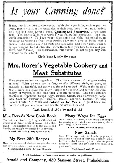 Most people use but few vegetables. They are not aware of the great variety at hand. What do you say to forty or fifty different kinds, all good, all palatable, all healthful, and easily bought and prepared. Well, in this book of Mrs. Rorer's she gives you many recipes for cooking and serving this great variety of vegetables, and tells their uses and purposes. The book contains chapters on Appetizers, Soups, Eggs, Sauces, Salads, Salad Dressings, Vegetable Cookery, Flavorings, Garnishes, Breads, Canning, Desserts, Pudding Sauces, Fruits, Nut Milks and Substitutes for Meats. A great book, and one that will pay, in comfort and health, many times its cost.