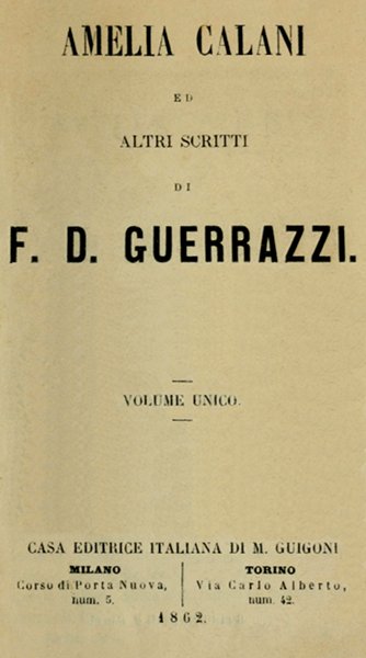 The Project Gutenberg EBook of Amelia Calani ed altri scritti, by Francesco Domenico Guerrazzi This eBook is for the use of anyone anywhere at no cost and with almost no restrictions whatsoever. You may copy it, give it away or re-use it under the terms of the Project Gutenberg License included with this eBook or online at www.gutenberg.org Title: Amelia Calani ed altri scritti Author: Francesco Domenico Guerrazzi Release Date: March 30, 2013 [EBook #42436] Language: Italian Character set encoding: UTF-8 *** START OF THIS PROJECT GUTENBERG EBOOK AMELIA CALANI ED ALTRI SCRITTI *** Produced by Carlo Traverso, Claudio Paganelli, Barbara Magni and the Online Distributed Proofreading Team at http://www.pgdp.net (This file was produced from images generously made available by The Internet Archive)