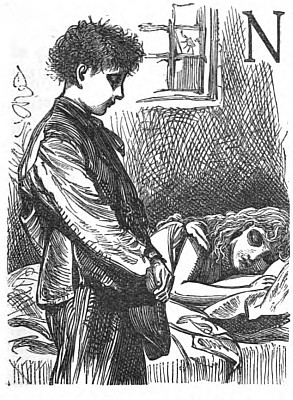 "Beg pardon," said Benny, in a fright, and hurried away just in time to escape a vigorous kick aimed at him by the infuriated young gentleman. "My stars and stockings!" he soliloquized, as he hurried up the bridge to join his sister. "If he 'ad a-catched me, I'd a-got a wolloping, an' no mistake. Hallo, Nell! what's a matter?" he said, as he saw great tears on the cheeks of his little crouching sister.