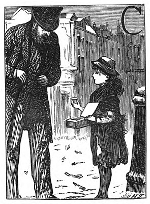 At length the great clocks all around began to strike five, and Benny had not come; a sense of unutterable loneliness crept over the child, and she began to cry. Besides, she was hungry and cold, and there was a great fear in her heart that something had befallen her brother. The last stroke of the Town Hall clock, however, had scarcely died away when she heard the patter of bare feet around the corner, and the next moment her brother, panting and breathless, stood before her.