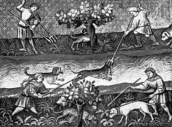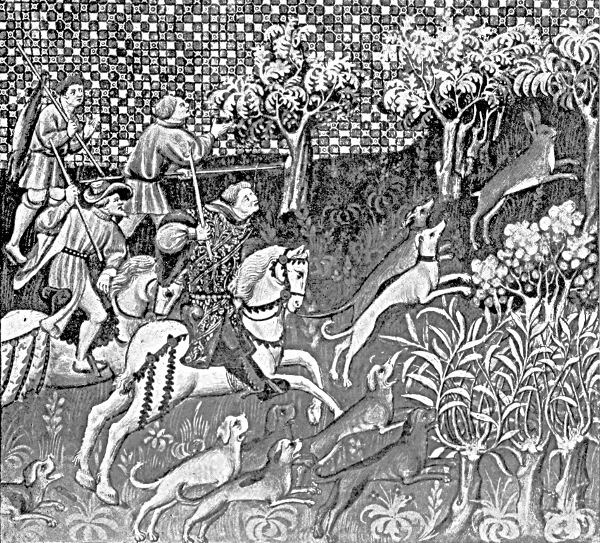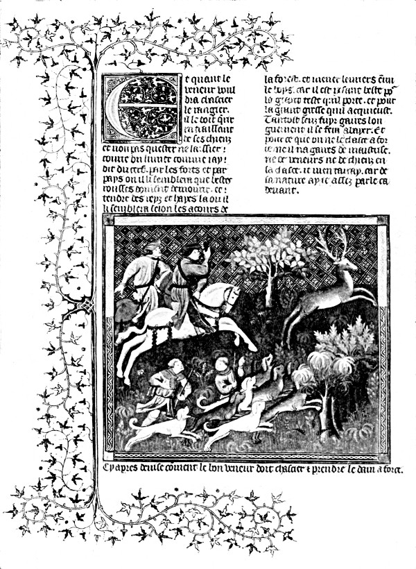 Now shall I prove how hunters live in this world more joyfully than any other men. For when the hunter riseth in the morning, and he sees a sweet and fair morn and clear weather and bright, and he [Pg 9] heareth the song of the small birds, the which sing so sweetly with great melody and full of love, each in it's own language in the best wise that it can according that it learneth of it's own kind. And when the sun is arisen, he shall see fresh dew upon the small twigs and grasses, and the sun by his virtue shall make them shine. And that is great joy and liking to the hunter's heart. After when he shall go to his quest or searching, he shall see or meet anon with the hart without great seeking, and shall harbour11 him well and readily within a little compass. It is great joy and liking to the hunter. And after when he shall come to the assembly or gathering, and he shall report before the Lord and his company that which he hath seen with his eyes, or by scantilon (measure) of the trace (slot) which he ought always of right to take, or by the fumes12 (excrements) that he shall put in his horn or in his lap. And every man shall say: Lo, here is a great hart and a deer of high meating or pasturing; go we and move him; the which things I shall declare hereafter, then can one say that the hunter has great joy. When he beginneth to hunt and he hath hunted but a little and he shall hear or see the hart start before him and shall well know that it is the right one, and his hounds that shall this day be finders, shall [Pg 10] come to the lair (bed), or to the fues (track), and shall there be uncoupled without any be left coupled, and they shall all run well and hunt, then hath the hunter great joy and great pleasure. Afterwards he leapeth on horseback, if he be of that estate, and else on foot with great haste to follow his hounds. And in case peradventure the hounds shall have gone far from where he uncoupled, he seeketh some advantage to get in front of his hounds. And then shall he see the hart pass before him, and shall holloa and rout mightily, and he shall see which hound come in the van-chase, and in the middle, and which are parfitours,13 according to the order in which they shall come. And when all the hounds have passed before him then shall he ride after them and shall rout and blow as loud as he may with great joy and great pleasure, and I assure you he thinketh of no other sin or of no other evil. And when the hart be overcome and shall be at bay he shall have pleasure. And after, when the hart is spayed14 and dead, he undoeth him and maketh his curée and enquireth or rewardeth his hounds, and so he shall have great pleasure, and when he cometh home he cometh joyfully, for his lord hath given him to drink of his good wine at the curée, and when he has come home [Pg 11] he shall doff his clothes and his shoes and his hose, and he shall wash his thighs and his legs, and peradventure all his body. And in the meanwhile he shall order well his supper, with wortes (roots) and of the neck of the hart and of other good meats, and good wine or ale. And when he hath well eaten and drunk he shall be glad and well, and well at his ease. And then shall he take the air in the evening of the night, for the great heat that he hath had. And then he shall go and drink and lie in his bed in fair fresh clothes, and shall sleep well and steadfastly all the night without any evil thoughts of any sins, wherefore I say that hunters go into Paradise when they die, and live in this world more joyfully than any other men. Yet I will prove to you how hunters live longer than any other men, for as Hippocras the doctor telleth: "full repletion of meat slayeth more men than any sword or knife." They eat and drink less than any other men of this world, for in the morning at the assembly they eat a little, and if they eat well at supper, they will by the morning have corrected their nature, for then they have eaten but little, and their nature will not be prevented from doing her digestion, whereby no wicked humours or superfluities may be engendered. And always, when a man is sick, men diet him and give him to drink water made of sugar and tysane and of such things for two or [Pg 12] three days to put down evil humours and his superfluities, and also make him void (purge). But for a hunter one need not do so, for he may have no repletion on account of the little meat, and by the travail that he hath. And, supposing that which can not be, and that he were full of wicked humours, yet men know well that the best way to terminate sickness that can be is to sweat. And when the hunters do their office on horseback or on foot they sweat often, then if they have any evil in them, it must (come) away in the sweating; so that he keep from cold after the heat. Therefore it seemeth to me I have proved enough. Leeches ordain for a sick man little meat and sweating for the terminating and healing of all things. And since hunters eat little and sweat always, they should live long and in health. Men desire in this world to live long in health and in joy, and after death the health of the soul. And hunters have all these things. Therefore be ye all hunters and ye shall do as wise men. Wherefore I counsel to all manner of folk of what estate or condition that they be, that they love hounds and hunting and the pleasure of hunting beasts of one kind or another, or hawking. For to be idle and to have no pleasure in either hounds or hawks is no good token. For as saith in his book Phœbus the Earl of Foix that noble hunter, he saw never a good man that had not pleasure in [Pg 13] some of these things, were he ever so great and rich. For if he had need to go to war he would not know what war is, for he would not be accustomed to travail, and so another man would have to do that which he should. For men say in old saws: "The lord is worth what his lands are worth."15 And also he saith in the aforesaid book, that he never saw a man tha