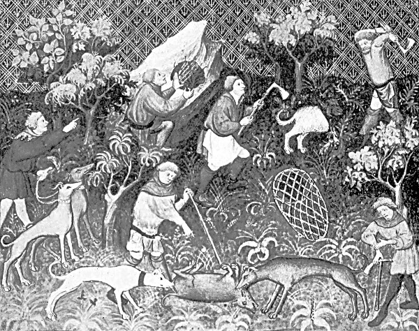 And first I will begin by describing the nature of the hare,3 secondly of the nature of the hart, thirdly of the buck and of his nature, fourthly of the roe and of his nature, fifthly of the wild boar and of his nature, sixthly of the wolf and of his nature, seventhly of the fox and of his nature, eighthly of the badger and of his nature, ninthly of the cat and of his nature, tenthly of the marten and his nature, eleventhly of the otter and of his nature. Now have I rehearsed how I will in this little book describe the nature of these aforesaid beasts of venery and of chace, and therefore will I name the hounds the which I will describe hereafter, both of their nature and conditions. And first I will begin with raches (running hounds)4 and their nature, and then greyhounds and their nature, and then alaunts and their nature, and then spaniels and their nature, and then mastiffs that men call curs and their nature, and then of [Pg 4] small curs that come to be terriers and their nature, and then I shall devise and tell the sicknesses of hounds and their diseases. And furthermore I will describe what qualities and manners a good hunter should have, and of what parts he should be, and after that I will describe the manner and shape of the kennel, and how it should be environed and arrayed. Also I will describe of what fashion a hunter's horn should be driven, and how the couplings should be made for the raches and of what length. Furthermore I will prove by sundry reasons in this little prologue, that the life of no man that useth gentle game and disport be less displeasable unto God than the life of a perfect and skilful hunter, or from which more good cometh. The first reason is that hunting causeth a man to eschew the seven deadly sins. Secondly men are better when riding, more just and more understanding, and more alert and more at ease and more undertaking, and better knowing of all countries and all passages; in short and long all good customs and manners cometh thereof, and the health of man and of his soul. For he that fleeth the seven deadly sins as we believe, he shall be saved, therefore a good hunter shall be saved, and in this world have joy enough and of gladness and of solace, so that he keep himself from two things. One is that he leave not the knowledge nor the [Pg 5] service of God, from whom all good cometh, for his hunting. The second that he lose not the service of his master for his hunting, nor his own duties which might profit him most. Now shall I prove how a hunter may not fall into any of the seven deadly sins. When a man is idle and reckless without work, and be not occupied in doing some thing, he abides in his bed or in his chamber, a thing which draweth men to imaginations of fleshly lust and pleasure. For such men have no wish but always to abide in one place, and think in pride, or in avarice, or in wrath, or in sloth, or in gluttony, or in lechery, or in envy. For the imagination of men rather turns to evil than to good, for the three enemies which mankind hath, are the devil, the world and the flesh, and this is proved enough.