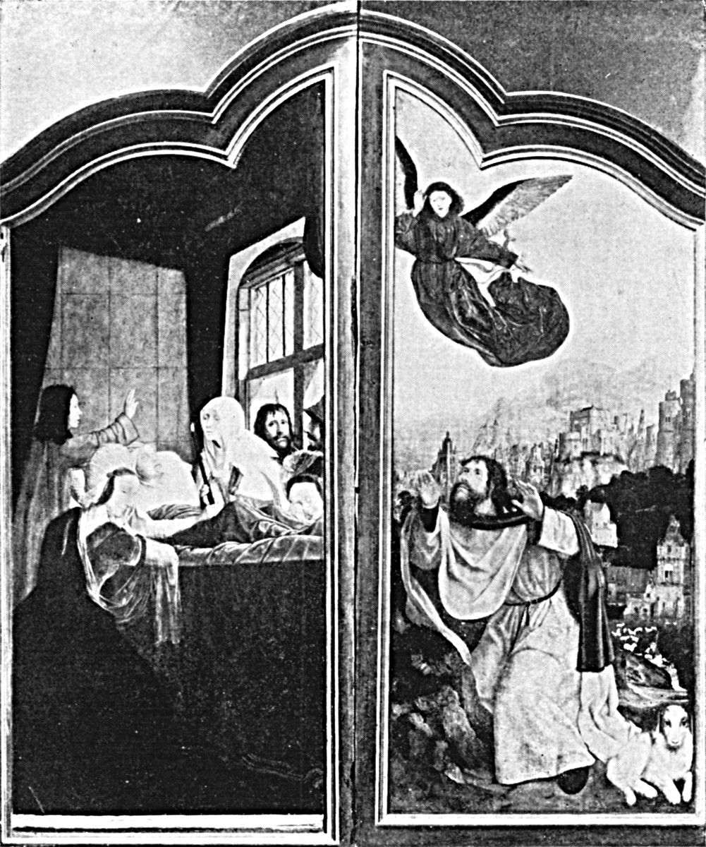 Profane and fierce were the men of Brabant, 'infinitos prædones, vulgo dictus Brabantiones, qui nec Deum diligunt nec viam veritatis cognoscere volunt,' as Aimoin has it, at the close of the ten hundreds; but for all that they had their heroes, and amongst them, too, were saints. Men like that mighty hunter, Hubert, Bishop of Liége (706-727), the apostle to whose untiring zeal Brabant in great measure owed her conversion to the Christian faith, and who, in the days of his stormy youth, before he met the stag with the cross between its horns, and turned devout, dwelt in a castle at a place called Tervueren, on the fringe of that mysterious forest of Soignes, which still overshadows Brussels, and which still, the peasant folk will tell you, he loves and protects: here he received holy orders, here he sang his first Mass, here, worn out with travail and fever, he died, with the fall of the leaf, in the year 727: no trace of his villa remains, but St. Hubert's Chapel, in the royal park of Tervueren, is said to mark its site, and on one of the walls of the parish church hard by, there still hangs an old ivory hunting horn, which once belonged, tradition says, to the huntsman's patron saint. Men like 'that impious robber Adhilck,' lord of Hesbaye, surnamed the Fierce, one of Charlemagne's ancestors, who, touched by the preaching of Saint-Amand, shaved off his beard, took a new name, Bavo, which means the mild, and changed, too, his manner of life, distributed all his goods to the poor, went and hid himself in the woods of Beyla, there did penance for seven years in the trunk of a hollow tree, which all that time was covered with leaves and flowers, and at last withdrew to the monastery which Amand had founded at Ghent, where he died in the [Pg 5] odour of sanctity, tended in his last moments by his friend Domlinus, a hermit from the distant forest of Thor, whom, because Bavo desired to bid him farewell,