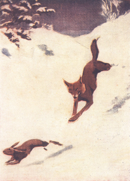 Now began one of the most thrilling stalks I ever witnessed, though, owing to the astonishing way the vixen hid herself, I could see little of her but her ears. To have rendered herself so inconspicuous she must have grovelled along on her belly in some slight hollow of the ground not visible to me; for the clover was not more than an inch high and of itself afforded very little concealment. The nearer she got the more excited I became; and for the life of me I could not understand—even now I cannot understand—why the hare, of all animals the timidest and most watchful, neither saw, heard, nor scented her. Inch by inch the clever little stalker wound her way until nearer approach without discovery must have been impossible. I was wondering why she delayed making one of her lightning-like rushes, when, with a tremendous bound, the[Pg 58] hare started off in a direction wide of my station. The vixen, who was in swift pursuit, made a desperate effort to turn him; but in this she would have failed, despite her wonderful fleetness, had not my little sister, whether by accident or design I do not know, suddenly showed herself at the gate for which the hare was heading. This had the effect of sending him towards the meuse I had been set to watch and of reminding me of my duty.
