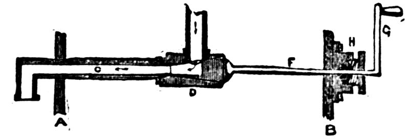43, Frame plate from end to end of engine. 44, Iron buffer-beam. 46, Cylinders. 50, Horn block, to carry axle-box and brass. 51, Axle-box and brass. 52, Slide bars. 53, Connecting-rod. 54, Driving axle. 55, Big end of driving axle. 56, Arm of driving axle. 59, Valve-spindle. 60, Valve-rod guide. 61, Pump. 76, Hand brake. 85, Brake blocks. 88, Trailing axle. 89, Leading axle. 90, Piston rod. 91, Piston head, held on the rod by a brass nut. 92, Backway eccentric rod. 93, Frontway eccentric rod. 94, Eccentric Straps. 95, Eccentric sheaves. 96, Tire. 97, Lip on tire. 98, Brake irons. 99, Foot plating. 100, Transverse stay. A, Water space between inside and outside fire boxes. B, Slide-block with end of pump-ram screwed into the end. C, Link motion (see 57, inside view). D, Slide valve rod, working guide. H, Inside journal, showing how the axle is supported inside of frame plates. I, Cross-head, solid, with piston rod.