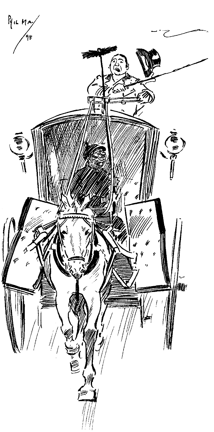 Only one vehicle on the rank. Engaged the cabman. Although I was unaccompanied by a relative or friend, found the space at my disposal distinctly limited. The top of the four-wheeler was, of course, occupied by the customary rocket party. The box had its usual sentry, carrying a couple of revolvers and a search-light. Three of the seats inside were occupied by sharpshooters, and I retained the fourth.