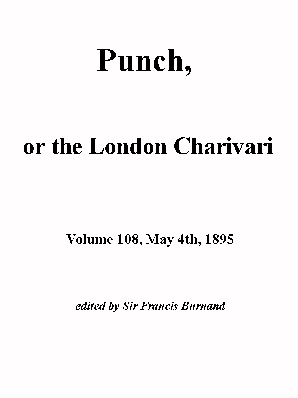 The Project Gutenberg EBook of Punch, or the London Charivari, Vol. 108, May 4th, 1895, by Various This eBook is for the use of anyone anywhere at no cost and with almost no restrictions whatsoever. You may copy it, give it away or re-use it under the terms of the Project Gutenberg License included with this eBook or online at www.gutenberg.org/license Title: Punch, or the London Charivari, Vol. 108, May 4th, 1895 Author: Various Editor: Sir Francis Burnand Release Date: January 26, 2014 [EBook #44759] Language: English Character set encoding: ISO-8859-1 *** START OF THIS PROJECT GUTENBERG EBOOK PUNCH, VOL. 108, MAY 4TH, 1895 *** Produced by Malcolm Farmer, Lesley Halamek and the Online Distributed Proofreading Team at http://www.pgdp.net