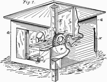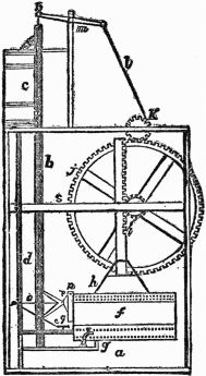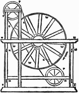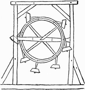 In the drawing we have now before us, the two upright posts, which are framed together and skilfully braced so as to ensure their steadiness, support between them a long horizontal axle, to the center of which is fixed a wheel with four spokes. The absence of perspective in this drawing makes the wheel appear as if it were parallel to the frame, instead of being, as it is, at right angles to it.
