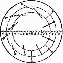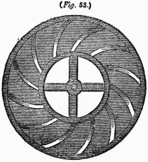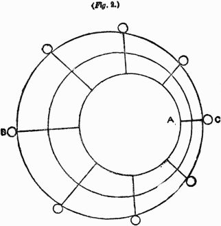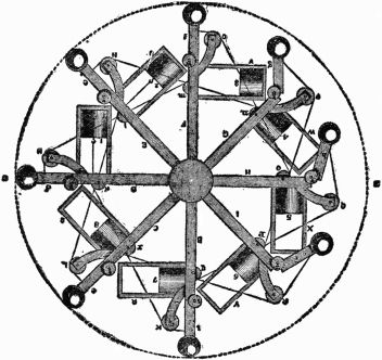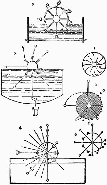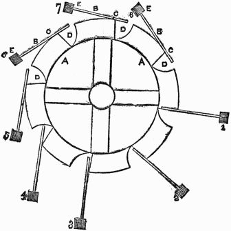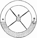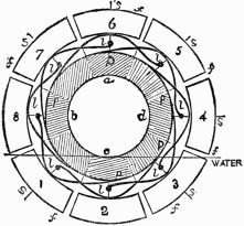 From the position in which the wheel is at present, it is evident that the weights on the right-hand side (1 and 2) acting at a greater distance from the center than those (4 and 5) on the other side, will cause that side to descend until the spoke 1 reaches the position 3, when it will exert no moving influence, but by which time the weight 8 will have fallen into the position 1, when a similar effect will take place, and so on with the rest.