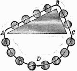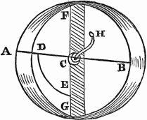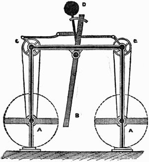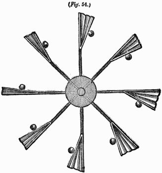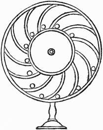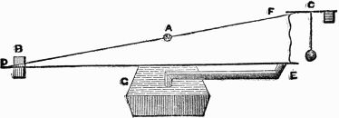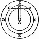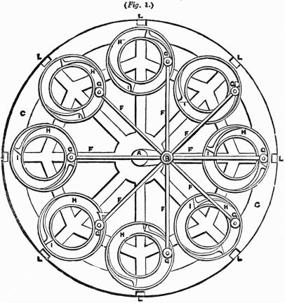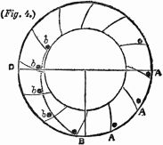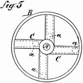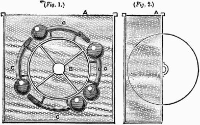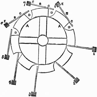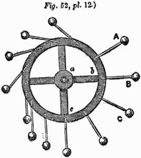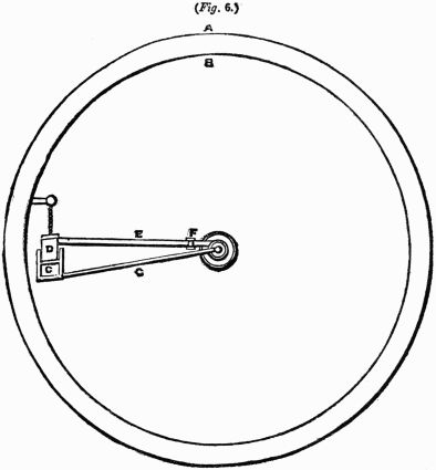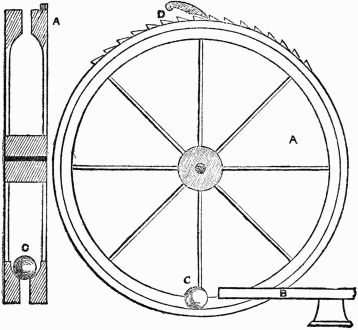 Description.—A A A is a ring of thin wood; B B B, several spokes, movable round the fixed points C C C, and only allowed to move one way by the construction of the openings D D D; E E E, heavy weights fixed to the ends of the spokes.