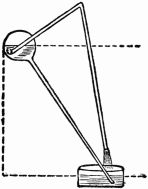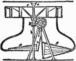 Seven mallets, or arms, each loaded with a heavy weight at the end, are jointed at equal distances to the circumference of the wheel, so that those which happen to have their joints below the diameter of the wheel will hang freely down, but if the wheel be turned round by hand or otherwise, the weights of those which24 are on the ascending side will, in succession, rest on its circumference, and will, in that position, be carried over the highest part of the wheel and downwards on the descending side, until the arms that bear them are brought into a vertical position and a little beyond it, and then the weight will fall suddenly over and rest on the opposite position on the circumference of the wheel, until its further descent enables it to dangle freely as before. The effect of this mechanism upon the position of the weights is not truly represented, for the upper mallet has fallen over too soon. In the modern form of this contrivance a pin, or stop, is introduced, by which the mallet, when it falls over, is compelled to rest so that its arm shall point to the center of the wheel, and thus the descending weight be held at a greater distance from the center than when ascending. It is extremely probable that this difference is a mere error of the artist, for the drawing has the appearance of having been made from a model of the wheel at rest; a condition in which, of course, it would always be found, unless moved by some external force. The inventor seems to have thought that the action above described would always place four weights on the descending side, and leave but three on the ascending side, each weight as it rises to the top being intended25 to leap suddenly over to the descending side, in the manner just explained; or perhaps, as M. Lassus suggests, the contriver imagined that the blows given to the wheel in succession by the falling mallets would help it forward. It is surprising that although the slightest model would show the failure of devices of this class to persons incapable of mathematical reasoning, yet such machines have been seriously proposed in books, and are continually recontrived by ingenious workmen. The allusion to quicksilver in the manuscript shows that26 Wilars was acquainted with the well-known contrivance described in the books already referred to, in which portions of that metal inclosed in channels are used instead of the falling weights.