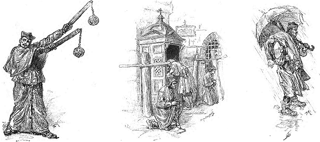 Quand nous pénétrons dans l'église, les pèlerins ont relevé leur cagoules et écoutent l'office divin appuyés sur leur croix ou prosternés contre terre. Vers la fin de la messe a lieu la confession: les divers confessionnaux sont pris d'assaut; le pénitent, debout, s'incline vers le prêtre, qui le tient embrassé en lui couvrant la tête de son camail, puis il va communier.