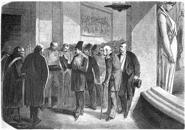 Nassr-ed-Din ne pouvait manquer de visiter le tombeau de l'empereur Napoléon qui est, avec Pierre le Grand et Charles XII, un de ses grands héros: «A la bonne heure, se plaît-il à dire, voilà des hommes!» Il les envie et, d'un peu loin il est vrai, il s'est efforcé de marcher sur leurs traces. C'est un batailleur aussi, comme c'est un chasseur. S'il a forcé des cerfs, il a aussi forcé des villes. Héral, entre autres, d'où son surnom: le Victorieux. On comprendra donc facilement son émotion lorsqu'il descendit dans la crypte, et lorsqu'il visita le reliquaire, surtout lorsqu'il tint dans ses mains l'épée d'Austerlitz et le petit chapeau d'Eylau. C'est le sujet de notre premier dessin. La visite s'est terminée par une promenade à travers les salles et les cours du musée d'artillerie.