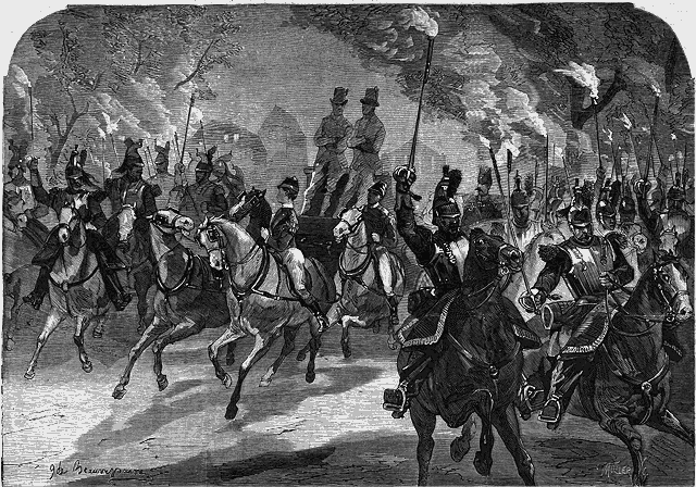 La fête de nuit a eu lieu sur le bassin de Neptune, entouré d'un double cercle de feux. La pelouse, les arbres, les fontaines, l'allée qui mène au château, l'horizon, tout resplendissait. En face du bassin, adossée au mur du boulevard de la Reine, s'élevait la tribune d'honneur, pour le shah et les invités officiels, dominant la tribune réservée aux personnes munies de cartes; Quant à la foule des curieux, elle se pressait, compacte, dans les allées latérales du bassin et les allées avoisinantes. Vers dix heures, grand mouvement dans cette foule. L'orchestre attaque l'hymne persan, auquel répondent dans les profondeurs du parc des fanfares de cors. C'est le shah qui arrive. Aussitôt des gerbes de feu partent de tous les coins du bassin, des fusées tracent leurs sillons d'or dans le ciel, où montent et éclatent en même temps des bombes multicolores. Puis, une sorte d'écusson lumineux se détache de la fumée, portant les armes de la Perse, le lion entouré des rayons du soleil. Finalement, bouquet monstre et feux de Bengale. C'est le signal du départ. Le shah est revenu à Paris, comme on le voit dans notre troisième dessin, en voiture, avec une escorte de cuirassiers portant des torches et galopant aux portières.
