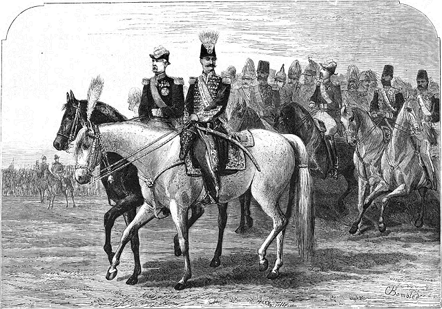 Le lendemain, jeudi, le shah assistait à la grande revue de Longchamps, passée en son honneur, et à trois heures précises, il arrivait à la porte de Madrid, où il se rencontrait avec le maréchal de Mac-Mahon, que suivait le plus brillant cortège. Le shah est réputé pour son exactitude, «cette politesse des rois». Une fois pourtant il y manqua, mais il n'en faut accuser que l'étiquette persane, très-sévère sur plus d'un point. Elle défend, par exemple, de rappeler au souverain qu'on l'attend, ou de le réveiller si par hasard il s'endort. Or, un soir, lors de sa visite à Saint-Pétersbourg, il devait rencontrer Alexandre II au grand bal de l'assemblée de la noblesse. L'empereur ne faillit pas attendre, il attendit réellement pendant plus de vingt minutes. Le shah s'était endormi avant le bal et personne n'avait osé le réveiller. Heureusement il n'avait pas eu à céder aux sollicitations du sommeil avant de quitter le palais Bourbon, si bien qu'à trois heures il descendait de voiture à la porte de Madrid, comme je l'ai dit, et sautait sur son cheval barbe Ek-Bolh, couvert d'un harnachement aussi étincelant de pierreries que l'uniforme de son cavalier. Le shah avait, en effet, revêtu son costume d'apparat. La poitrine, le col ruisselaient de diamants. Une ceinture de rubis, d'émeraudes et d'autres pierres le serrait à la taille. A cette ceinture qui, d'après la trésorerie de la cour de Perse, vaut à elle seule un million, était suspendu un cimeterre, dont le fourreau est un chef-d'œuvre de joaillerie. On le croirait fait d'un seul diamant tant les pierres qui le composent sont de la plus parfaite sertissure. C'est ainsi que le shah, comme le montre notre quatrième dessin, est arrivé sur le terrain de Bagatelle, et qu'il a parcouru assez rapidement deux des lignes de bataille; puis il est allé prendre place à l'ancienne tribune impériale, entre le président de l'Assemblée et le vice-président du Conseil. Les députés occupaient la tribune de droite; le Conseil municipal celle de gauche. Quant au maréchal de Mac-Mahon, c'est sur la pelouse, en face de la tribune, qu'il s'était placé. Alors le défilé a eu lieu au milieu des applaudissements de la foule énorme que ce spectacle imposant avait attiré au bois de Boulogne. Notons que l'infanterie de marine et les cuirassiers ont eu un succès exceptionnel. A six heures et demie, le défilé était terminé, et le shah remontait en voiture pour rentrer au palais Bourbon.