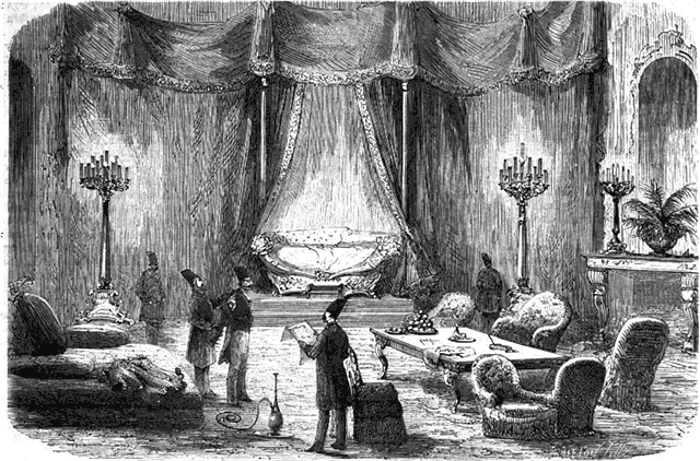 Quand je dis comme un simple mortel, ce n'est pas tout à fait exact. Aucun des actes de la vie intime d'un roi, et surtout d'un roi de Perse, ne peut s'accomplir aussi simplement que cela. Il suffira, pour s'édifier à ce sujet, de jeter un coup d'œil sur la huitième page des dessins que renferme ce numéro. Il y a dans cette page quatre croquis, dont l'un représenté précisément le shah dans sa chambre à coucher. Chambre magnifiquement décorée, comme on peut penser. Mais la chose importante, c'est le lit. Il est élevé sur une estrade de deux marches recouvertes de velours grenat, et présente la forme de deux cornes d'abondance se réunissant par la base. Deux candélabres énormes sont placés à la tête et au pied, et un dais, composé de tentures de velours grenat également, et brodées d'or, le couronne. Un petit escabeau placé sur la seconde marche de l'estrade permet au shah d'enjamber le lit. C'est là qu'il repose, mais non pas comme vous et moi, fermant les yeux et autant que possible ne faisant qu'un somme, après avoir soufflé sa bougie. Le sommeil du shah est intermittent. De temps à autre son grand-vizir, ou quelque autre dignitaire descend du premier étage pour lui communiquer une nouvelle; ou bien encore il se réveille pour manger une orange que s'empresse de lui présenter quelqu'un des familiers qui passent la nuit dans sa chambre. Deux d'entre eux doivent constamment l'éventer avec la main lorsqu'il repose, et grimpent sur le lit pour accomplir leur mission qu'ils n'interrompent que pendant que le shah reçoit une communication ou suce une orange. Il en mange ainsi cinq ou six chaque nuit. Il y en a toujours dans sa chambre une pleine corbeille posée sur une table d'ébène incrustée d'or, où se trouvent également une assiette de macarons, un verre d'eau, ses lunettes et quelques journaux que son médecin, le docteur Tholozan, lui lit tous les matins en venant prendre de ses nouvelles. Après quoi le shah procède à sa toilette, ou plutôt on procède à la toilette du shah. L'opération a lieu dans un boudoir entièrement tendu de satin bleu broché, et meublé d'une toilette avec deux cuvettes à l'anglaise, d'un grand divan et d'un fauteuil, canne et bois noir, très-léger, profond, avec dossier plein. Notre dessin représente le shah qu'est en train de raser son barbier, accompagné de deux aides. Il est vêtu d'une espèce de stambouline, tunique à petits plis, de couleur grise et bordée de fourrures. Il y a aussi le bain. Celui dont use le shah est l'ancien bain du duc de Morny, en marbre blanc, avec tapis de cordes. La baignoire, établie au milieu de la pièce, dont la seconde moitié est surélevée, a la forme d'une tourelle, ou plutôt d'une grande margelle de puits, que traversent deux cordes destinées à servir de points d'appui. Au-dessus il y a aussi un petit trapèze dont l'usage ne demande pas d'explications. Le shah prend son bain à une température très-élevée. Il y entre, tête nue, habillé de mousseline blanche, causant avec une douzaine de ses familiers qui sont là pour le distraire, mais qui, n'était le respect, riraient souvent jaune, j'imagine, vu la température élevée du lieu. Cependant l'appétit est venu et l'heure du déjeuner approche. Nassr-ed-Din est servi dans son salon particulier et mange seul. Les mets sont préparés à la française par un chef français; toutefois ce sont des cuisiniers persans qui préparent les mets spéciaux, riz en pilaco, en bouillie et au gras, petits poissons au safran, etc. Le shah mange les mets français avec une fourchette, et les mets nationaux avec ses doigts, les doigts de la main droite, que pour cette raison il plonge à chaque instant dans un aiguière placée à côté de lui et qu'il présente ensuite à un domestique chargé de la lui essuyer. Il aime beaucoup les fruits: les oranges, les pêches, surtout les cerises, et cela se comprend. Ce qui se comprend moins, c'est sa façon de manger ces dernières: trempées dans le sel. Le café et le thé sont servis par le cafedgi, sorte d'échanson ayant rang à la cour. Ce fonctionnaire porte une robe en cachemire à fond violet, à palmes rouge et or. Deux domestiques sont attachés à sa personne. Quant à lui, il ne sert que le roi. Mais, assez regardé par dessus le mur de la vie privée du shah! Otons l'échelle.