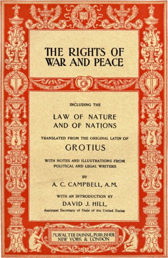 Of all benefactors in Literature of the human race, Grotius may perhaps rank as first among his equals. Centuries have borne witness to the justness of his premises and the wisdom of his conclusions. The principles of national law laid down by him are to-day accepted as the axioms of the Science. Among the nations, perhaps the United States is most deeply interested in the right administration of the principles affirmed by Grotius in his gigantic work on the "Rights of War and Peace," and it was therefore most fitting, when the recent peace conference at The Hague completed the great structure of international comity, the foundations of which were laid by Grotius in 1625, that a silver wreath was laid by the representative of the United States upon the grave of the man to whom the Conference owed its initial impulse, although at a distance in time of nearly three centuries.