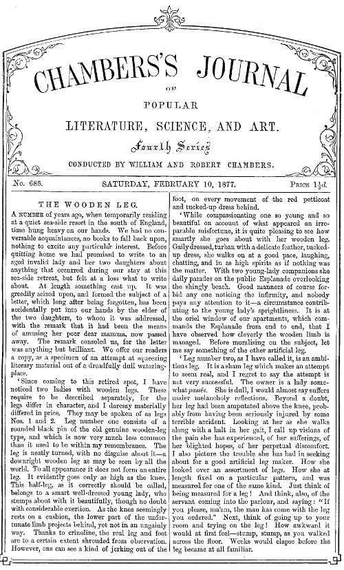 'Since coming to this retired spot, I have noticed two ladies with wooden legs. These require to be described separately, for the legs differ in character, and I daresay materially differed in price. They may be spoken of as legs Nos. 1 and 2. Leg number one consists of a rounded black pin of the old genuine wooden-leg type, and which is now very much less common than it used to be within my remembrance. The leg is neatly turned, with no disguise about it—a downright wooden leg as may be seen by all the world. To all appearance it does not form an entire leg. It evidently goes only as high as the knee. This half-leg, as it correctly should be called, belongs to a smart well-dressed young lady, who stumps about with it beautifully, though no doubt with considerable exertion. As the knee seemingly rests on a cushion, the lower part of the unfortunate limb projects behind, yet not in an ungainly way. Thanks to crinoline, the real leg and foot are to a certain extent shrouded from observation. However, one can see a kind of jerking out of the foot, on every movement of the red petticoat and tucked-up dress behind.
