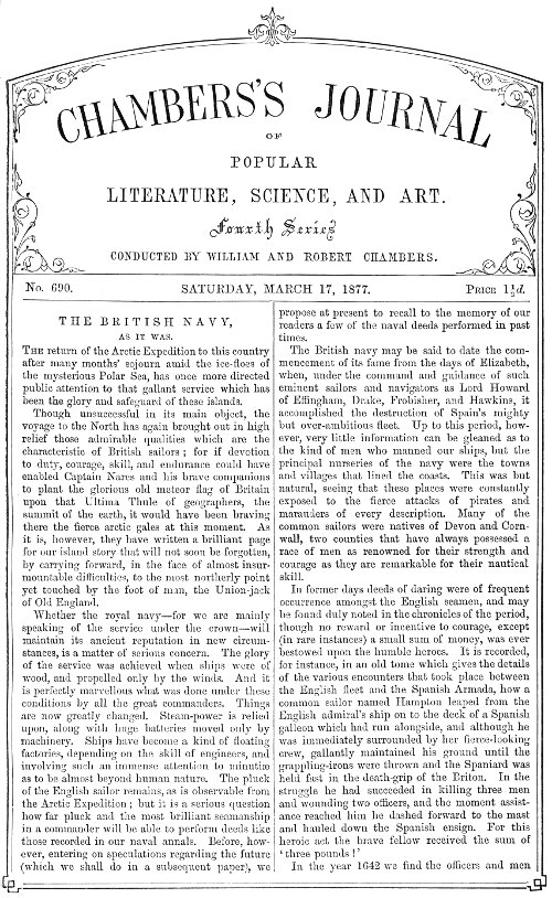 Whether the royal navy—for we are mainly speaking of the service under the crown—will maintain its ancient reputation in new circumstances, is a matter of serious concern. The glory of the service was achieved when ships were of wood, and propelled only by the winds. And it is perfectly marvellous what was done under these conditions by all the great commanders. Things are now greatly changed. Steam-power is relied upon, along with huge batteries moved only by machinery. Ships have become a kind of floating factories, depending on the skill of engineers, and involving such an immense attention to minutiĉ as to be almost beyond human nature. The pluck of the English sailor remains, as is observable from the Arctic Expedition; but it is a serious question how far pluck and the most brilliant seamanship in a commander will be able to perform deeds like those recorded in our naval annals. Before, however, entering on speculations regarding the future (which we shall do in a subsequent paper), we propose at present to recall to the memory of our readers a few of the naval deeds performed in past times.