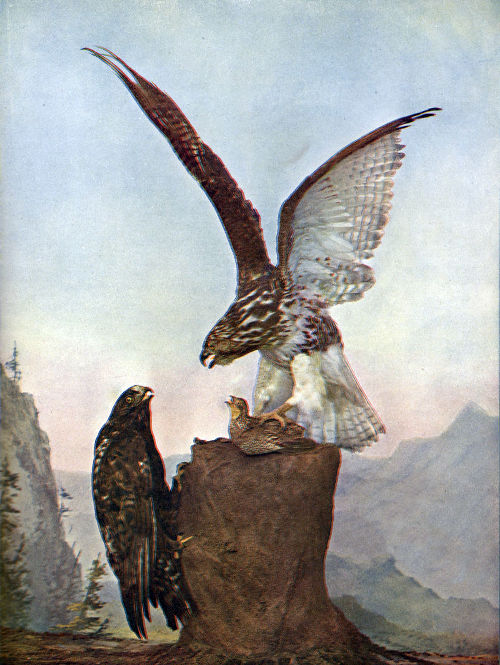 The Red-tailed Hawk (Buteo borealis) of our illustration is young and shows the plumage of the immature form.