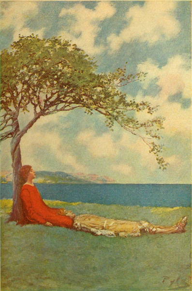 "I am sorry, child," said Zuan Gradenigo. "We did not come here to ill-treat women. I shall see that my men[32] are punished for what they have done. Meanwhile—" He took up the mantle which he had put aside over a near-by bench, and, crossing the room, laid it over the girl's shoulders. It covered her almost to the feet. And when he had done this he stood, for what he imagined to be a moment, looking down into the eyes that held his so steadily—brave eyes, unafraid, unclouded, unwavering. One could not be harsh or cruel in the gaze of such—even though they looked from the face of an enemy. An enemy? Nonsense! A girl taken by chance as she wandered through the wood—as she peeped, full of childish curiosity, at the disembarkment of a ship's load of soldiers. Brave eyes, unafraid. That was why[33] they held him so, because they fronted him without fear—even with trust.