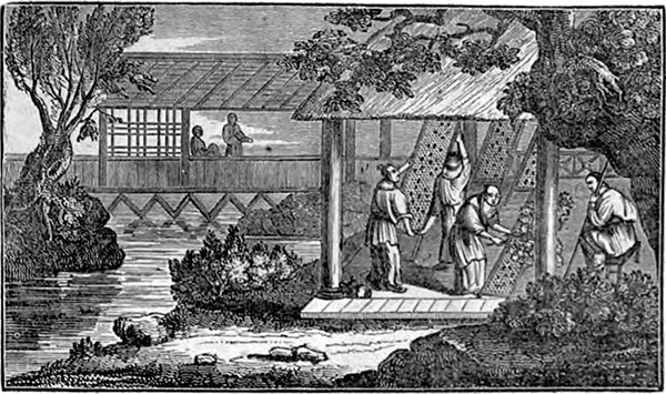 "For the purpose of paying them every attention, an affectionate mother is provided for the worms, who is careful to supply their wants; she is called Isan-mon, mother of the worms. She takes possession of the chamber, but not till she has washed herself and put on clean clothes, which have not the least ill smell; she must not have eaten any thing immediately before, or have handled any wild succory, the smell of which is very prejudicial to these tender creatures; she must be clothed in a plain habit, without any lining, that she may be more sensible of the warmth of the place, and accordingly increase or lessen the fire, but she must carefully avoid making a smoke or raising a dust, which would be very offensive to these tender creatures, which must be carefully humoured before the first time of casting their slough. Every day is to them a year, and has in a manner the four seasons; the morning is the spring, the middle of the day the summer, the evening the autumn, and the night the winter."