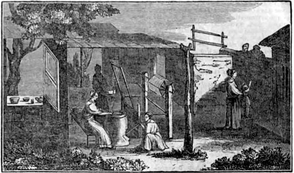 The engravings which illustrate this article are copied from original Chinese drawings: the first shows the apartment in which the worms are fed, and the manner in which the little trays containing them are arranged. In the second, the cocoons being completed by the insect, are being cleared of dirt and dead leaves, before they are removed from the frames on which they had spun. The third represents the[Pg 4] winding off the silk into singles, but the windster appears for the moment to have left her post for the purpose of blowing the fire. In the fourth engraving, a Chinese silk-loom, is shown; the figure seated above, among the machinery, appears to assist the labour by means of her weight.