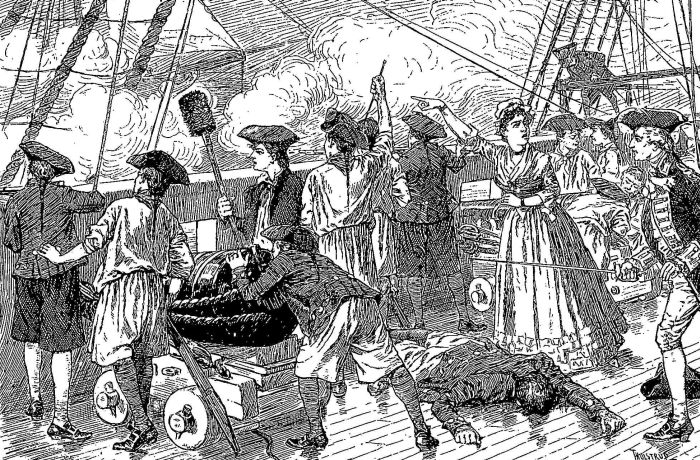Nearly a month later these Scotch loyalists were routed, dispersed, made prisoners, or killed in battle on Moore's Creek. Flora's husband was among the prisoners, and was sent to Halifax jail. He was soon afterward released, when he left North Carolina with his family for Scotland in a British sloop of war. On the way the vessel was attacked by a French vessel of war. The courage of the English sailors appeared to desert them, and capture seemed inevitable, when Flora ascended to the deck, and by words and deeds so stimulated their spirits that they beat off the enemy, and the Macdonalds were landed safely on their native soil of Skye. During the engagement Flora was severely wounded in the hand. She said, sometimes, when speaking of the peculiarity of her situation. "I have hazarded my life both for the house of Stuart and the house of Hanover, and I do not see that I am a great gainer by it."