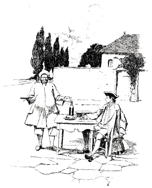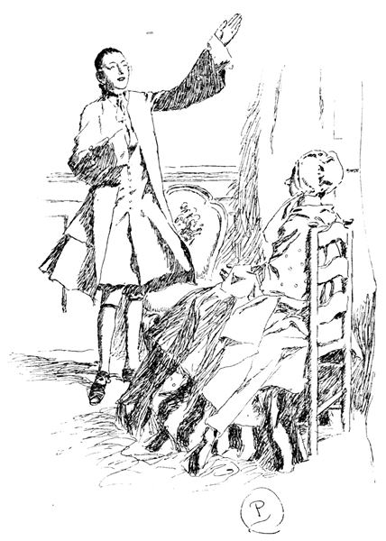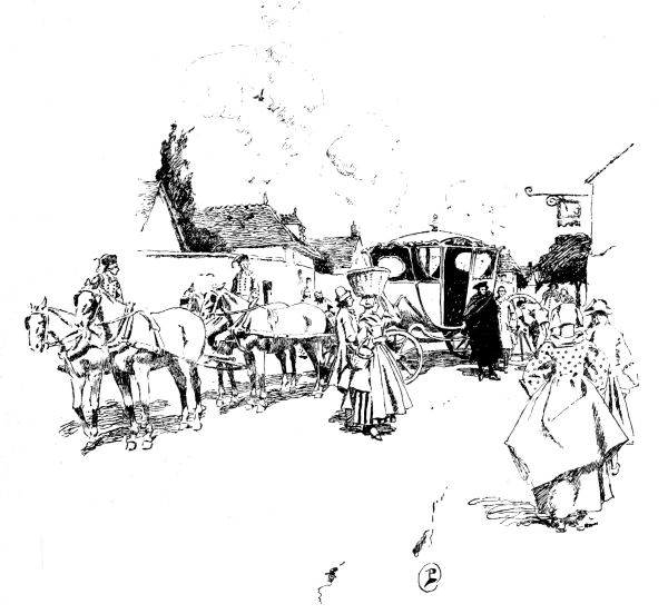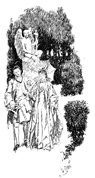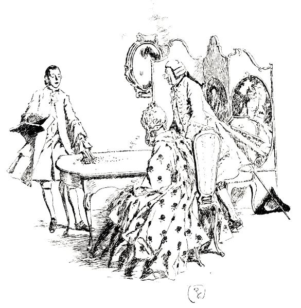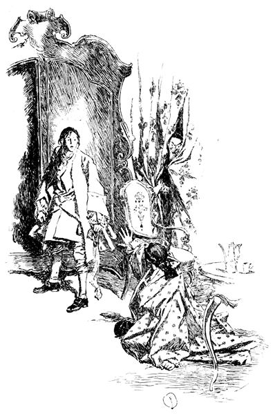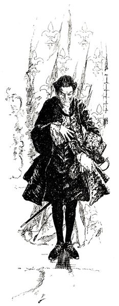 Flourens was a little town lying quite out of the usual route of young English travellers of rich connections making the "grand tour," and so, having nothing to recommend it in itself, was unknown to the great world without—dull, stupid, stagnant. Hardly ever a visitor from that great outside world appeared within the circle of its hopeless isolation. So it was a very strange thing to the town when one morning a great coach, as big as a house, dragged by four horses, with postilions clad in scarlet faced with blue, their legs incased in huge jack-boots, and each with a club queue as thick as his wrist hanging down his back, came whirling, rattling, lumbering, in the midst of a swirling cloud of dust, into the silence of the town. It was twice wonderful when the coach stopped at the inn, and it was thrice wonderful when an odd, lean, wizened little man, evidently the servant, let down the [Pg 8]steps and helped a strange gentleman from within. He was a tall, dark gentleman, dressed in black from head to foot—from the black hat with the black feather to the black silk stockings. From the gentleman's shoulder hung a long black cloak trimmed and lined with black fur, and Flourens had never seen his like before. He neither looked to the right nor to the left, but, without saying good or bad to any living soul, he and the odd, lean little servant entered the inn, leaving the crowd that stood without staring and gaping after him. Then the great coach disappeared through the arched gate that led to the stable-yard, but it was a long time before the crowd began to disperse, before the gossiping began to cease, before the cloud of silence and dullness and stagnation settled by degrees upon the town again. How it was maybe an hour and a half, and the last of those who had looked and wondered had gone about their business.