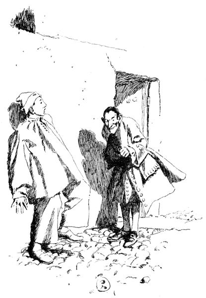 The strange gentleman, when he had come to within a little distance of Oliver, stopped, and beckoning to the little lean serving-man who followed him, held a short whispered talk with him. The little lean serving-man nodded, and then the stranger came straight across the street.