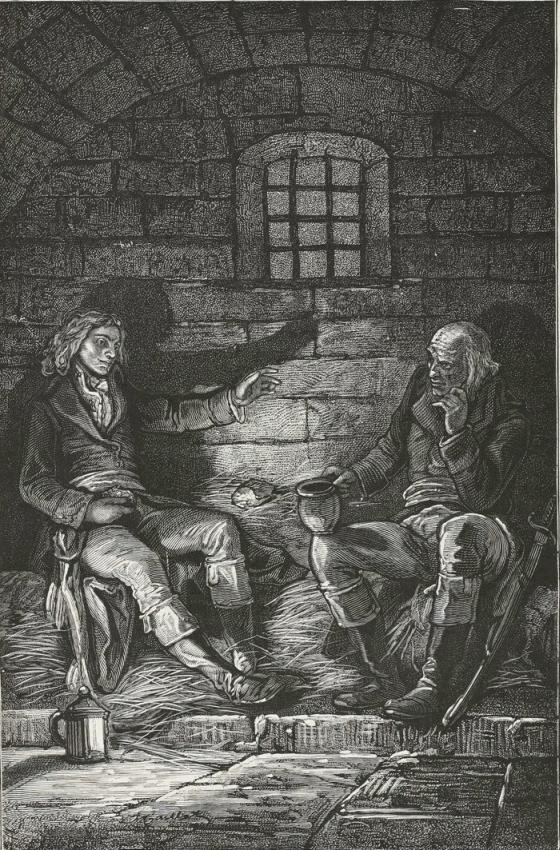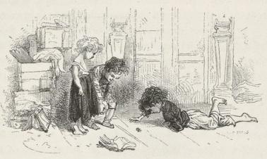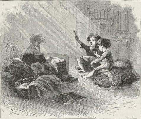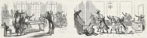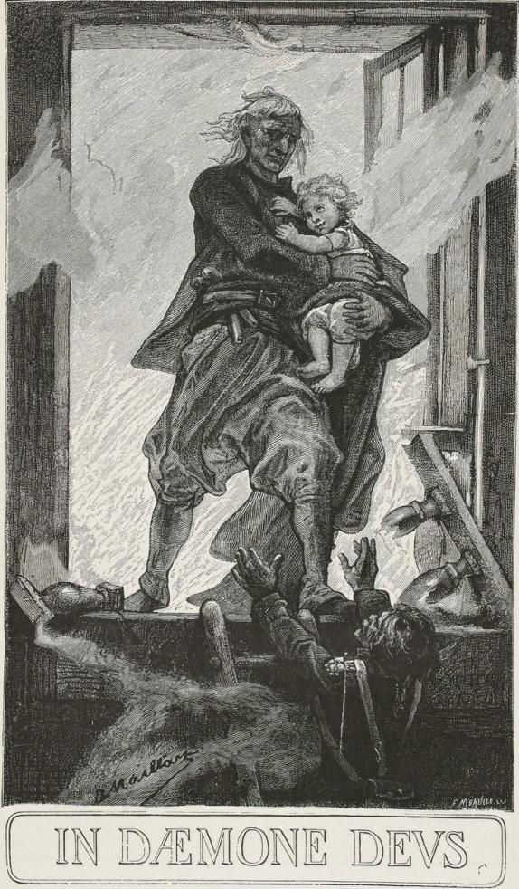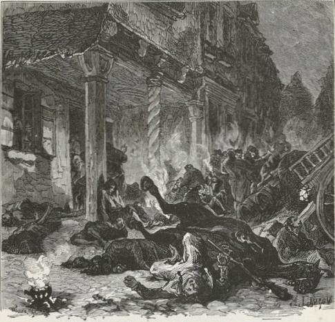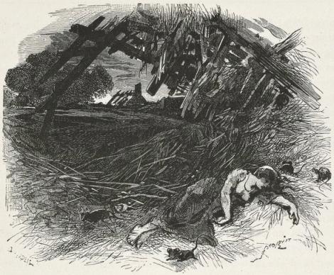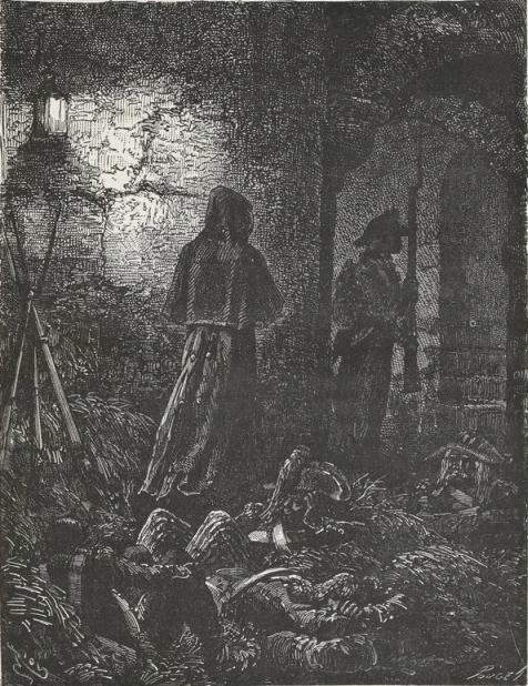 The woman, surprised, bewildered, and stunned, was gazing around, as though in a dream, at these muskets, sabres, bayonets, and savage faces. The two children awoke and began to cry.