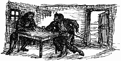 Als ich mit dem Rum zurückkam, saßen die beiden schon, jeder an einer Seite des Frühstückstisches — der schwarze Hund näher zur Tür und seitlich, so zwar, daß er seinen alten Kameraden beobachten und ihm gegebenenfalls auch den Rückzug abschneiden konnte.