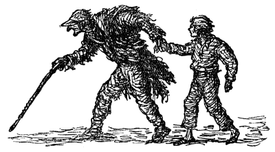Ich kann gar nicht sagen, wie dieser geheimnisvolle Mensch mich in meine Träume hinein verfolgte. In stürmischen Nächten, wenn der Wind das Haus erschütterte und die Brandung gegen Bucht und Klippen brauste, erblickte ich ihn in tausend Gestalten und in tausendfältigen, teuflischen Formen. Einmal war das Bein am Knie abgeschnitten, einmal an der Hüfte, dann wieder erschien er mir als ein Fabelwesen, das immer nur ein Bein gehabt hatte, und zwar in der Mitte des Körpers. Ihn hüpfen[S. 14] und springen zu sehen und von ihm über Stock und Stein verfolgt zu werden, war mein entsetzlichster Angsttraum. Und das Vierpennystück war teuer genug erkauft mit diesen Gesichten.