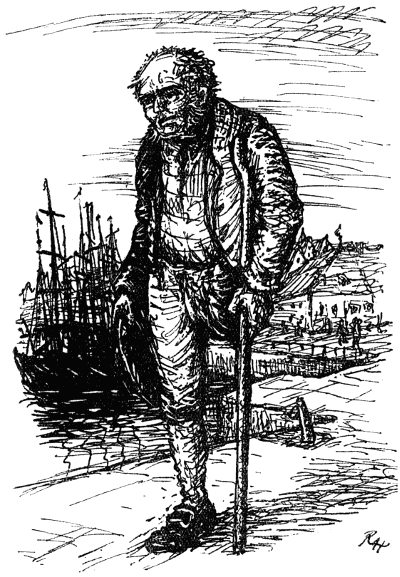 Solange der Kapitän bei uns lebte, wechselte er nie seine Kleidung, bis auf die Strümpfe, die er bei einer vorüberkommenden Hökerin kaufte. Als einmal ein Windstoß eine seiner Hutfedern knickte, ließ er sie in der Folge herunterhängen, obwohl das sehr unbequem war, wenn es blies. Ich erinnere mich noch genau an seinen Rock, den er oben auf seinem Zimmer selbst flickte und der zuletzt nur noch aus Flecken bestand. Er schrieb weder, noch bekam er je einen Brief, und sprach selbst mit den Nachbarn fast nur dann, wenn er betrunken war. Niemand von uns sah jemals den großen Kajütenkoffer geöffnet.