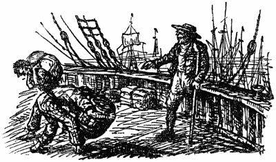 „Also gut,“ meinte er darauf, „das ist mein Ankerplatz. Heda! Freundchen!“ schrie er den Mann an, der den Karren mit seinem Koffer schob; „komm herüber und trag den Koffer hinauf. Hier will ich eine Weile bleiben“, fuhr er fort. „Ich bin ein einfacher Mann. Ich brauche nichts als Rum, Speck und Eier und die Anhöhe dort, von wo aus ich die abfahrenden Schiffe beobachten kann. — Wie Ihr mich titulieren sollt? Na, nennt mich Kapitän. — — Ja so, ich weiß schon, was Ihr noch wollt. Da!“ — — — Und damit warf er drei oder vier Goldstücke hin. „Ihr könnt mir’s sagen, wenn ich damit fertig bin“, sagte er und schaute stolz und befehlend herum.