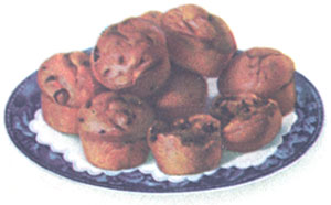 Sift together flour, cocoa, sugar, salt, cinnamon and baking powder. Add raisins, then milk slowly to make a smooth batter. Add shortening and mix thoroughly. Put 1 tablespoon batter in each greased muffin tin and bake in moderate oven (400°) for about 20 minutes.