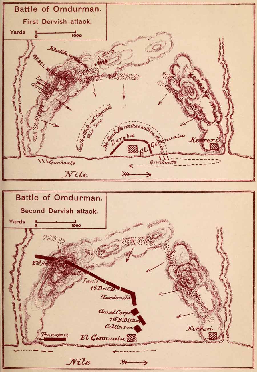 A Comfortable Breakfast—All ready for the Dervishes—Egyptian Cavalry engage the Enemy—Gunboats to the Rescue—The Joy of Battle—Here they come!—A [xi] Splendid Spectacle—The Dervishes open Fire—The First Shell—A Dervish Battery—Effect of our Shell Fire—Wounded Men—Curious Tricks played by Bullets—Maxims at Work—A Dervish Cavalry Charge—Persistent Sharpshooters—The Army leaves the Zeriba—The Lancers' Charge—Mutilation of the Dead—Wounded Horses—Killing the Wounded Dervishes—Renewal of the Fight—Steadiness of the Sudanese and Egyptians—Final Repulse of the Enemy—Dreadful Effects of our Fire—Men falling out—We halt beside a Khor—Regimental Music—Escape of the Khalifa—Death of Hon. Hubert Howard—A Champagne Dinner in the Street—The End of Mahdism
