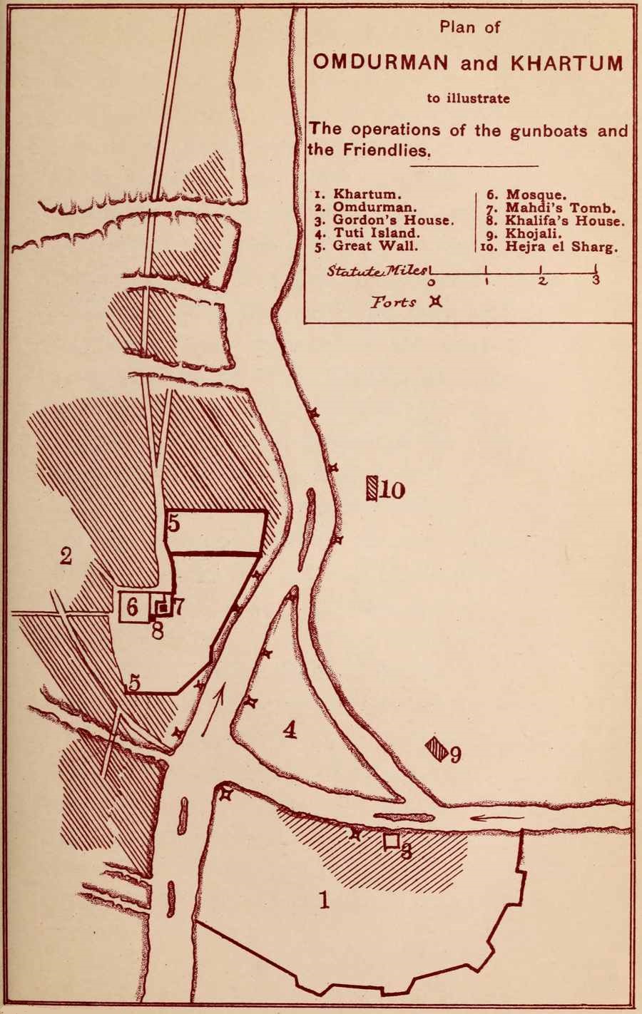| Plan of Omdurman and Khartum to illustrate the Operations of the Gunboats and the Friendlies | Facing page 214 |