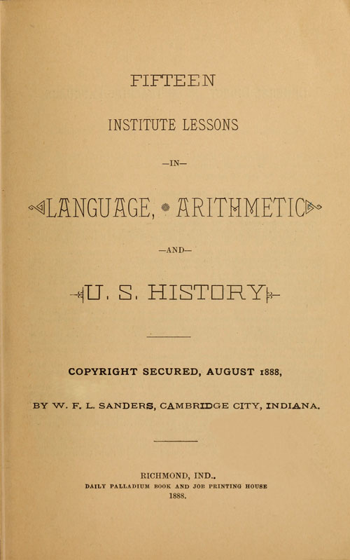 The Project Gutenberg EBook of Fifteen Institute Lessons in Language, Arithmetic, and U.S. History, by W. F. L. Sanders This eBook is for the use of anyone anywhere in the United States and most other parts of the world at no cost and with almost no restrictions whatsoever. You may copy it, give it away or re-use it under the terms of the Project Gutenberg License included with this eBook or online at www.gutenberg.org. If you are not located in the United States, you'll have to check the laws of the country where you are located before using this ebook. Title: Fifteen Institute Lessons in Language, Arithmetic, and U.S. History Author: W. F. L. Sanders Release Date: June 28, 2016 [EBook #52429] Language: English Character set encoding: UTF-8 *** START OF THIS PROJECT GUTENBERG EBOOK FIFTEEN INSTITUTE LESSONS *** Produced by Charlene Taylor, ellinora and the Online Distributed Proofreading Team at http://www.pgdp.net (This file was produced from images generously made available by The Internet Archive/American Libraries.)