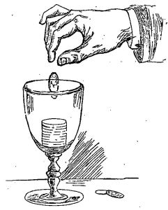 By dropping the coins very carefully into the water edge-ways, it will be found that even as many as five or six coins the size of a silver dollar can be dropped into the water before it overflows.