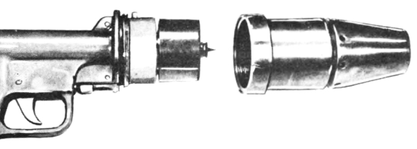c. If no additional shots are to be fired before refilling and recharging, open pressure-tank valve by turning handle counterclockwise. Point the gun away from personnel and blow out the remaining fuel and pressure, if any, from the fuel tanks by squeezing the valve lever and grip safety until there is no further discharge. The trigger should not be used during this operation. Then close the pressure-tank valve to prevent entrance of foreign matter into the pressure system.